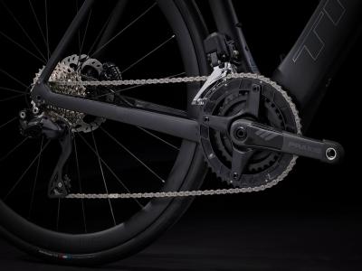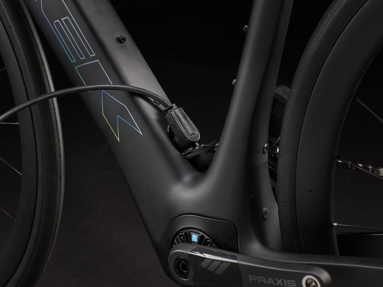 Einen äußerst leichten Rahmen aus 800 Series OCLV Carbon mit hinterem IsoSpeed. Einen kraftvollen Harmonic Pinring-Motor von TQ mit einem Drehmoment von 50 Nm, der dich bis zu einer Geschwindigkeit von 25 km/h unterstützt, einen 360 Wh großen integrierten Akku, ein in den Rahmen integriertes, smartes LED-Display und diskret in die Bremsgriffgummis verbaute Bedienelemente für das Umschalten der Unterstützungsmodi. Aeolus Pro 37-Laufräder aus OCLV Carbon, eine drahtlose, elektronische Shimano 105 Di2 2x12-Schaltung, eine Carbonkurbelgarnitur, ein vibrationsdämpfender Bontrager Pro IsoCore-Lenker und ein RCS Pro-Vorbau mit vollstän