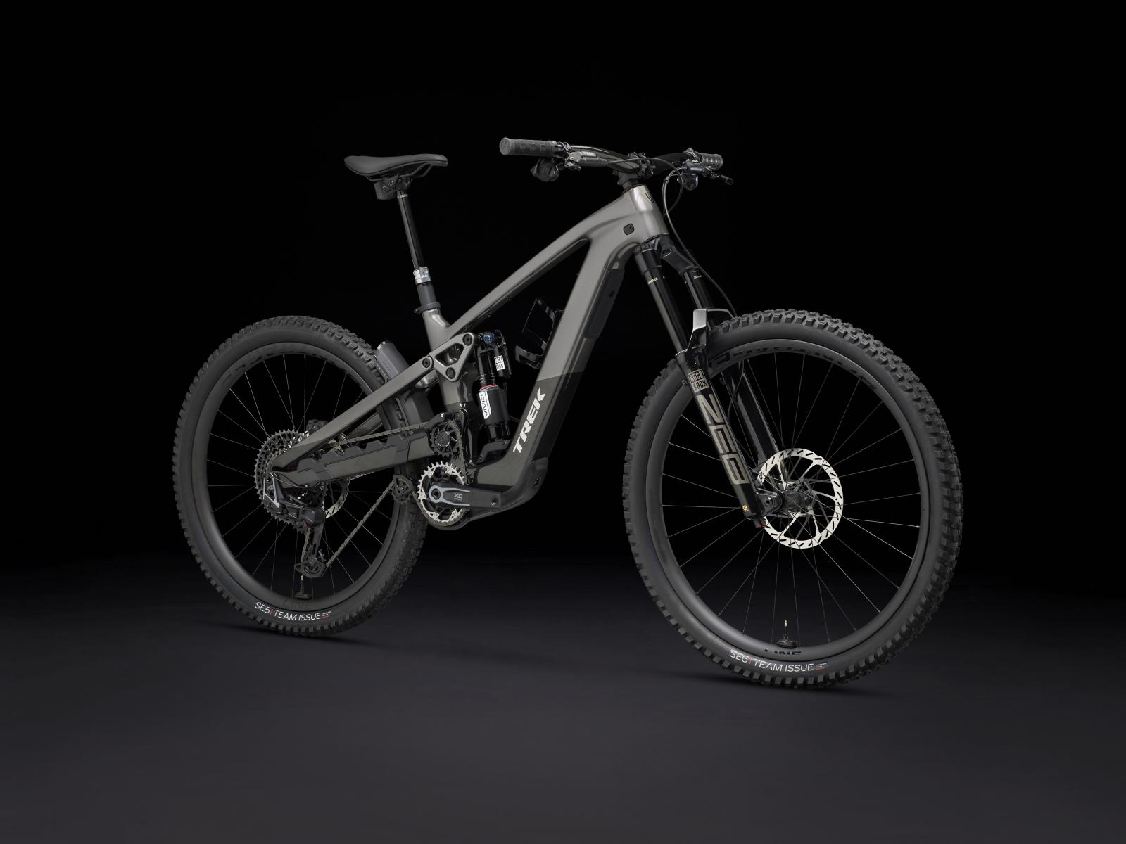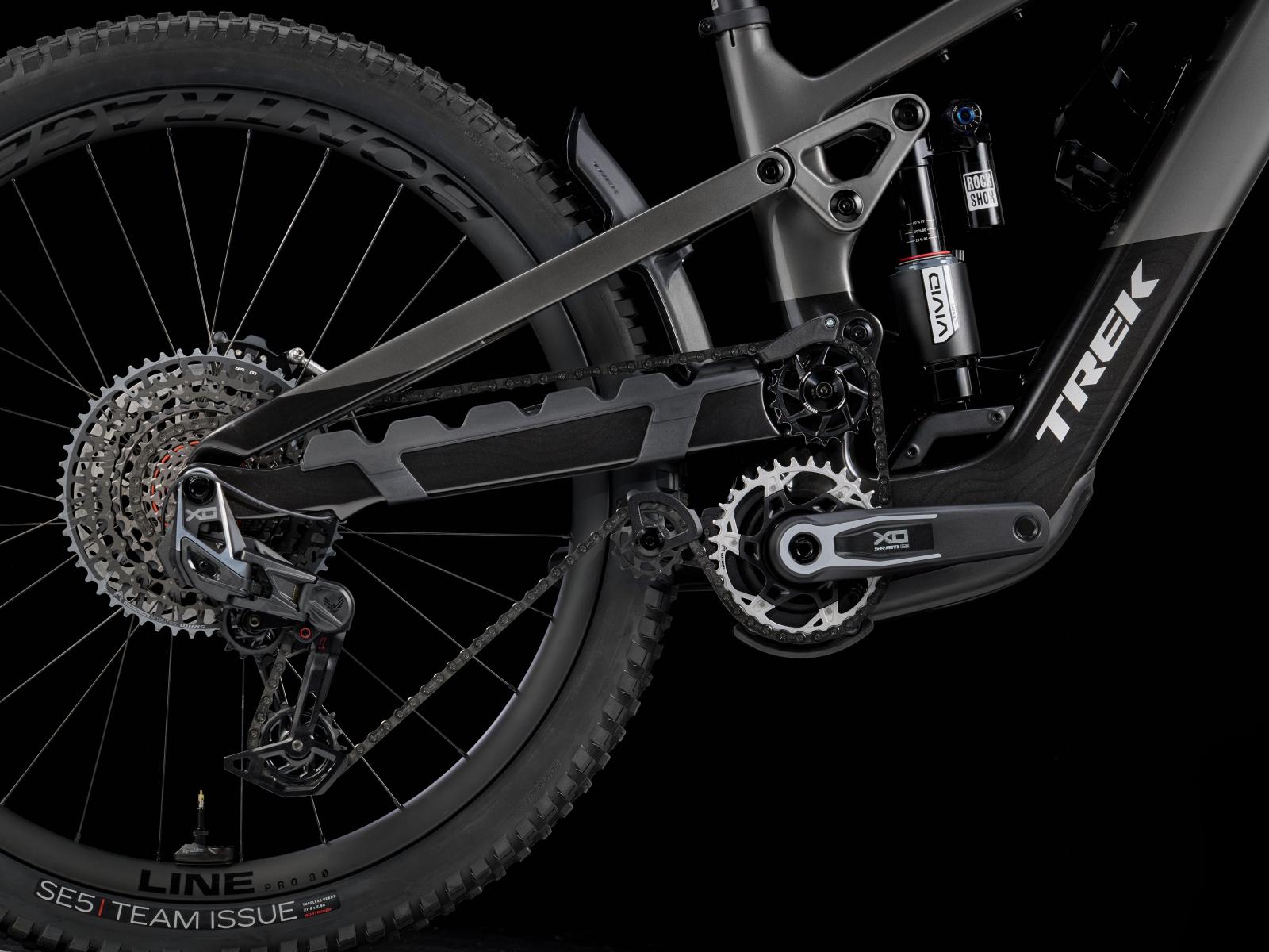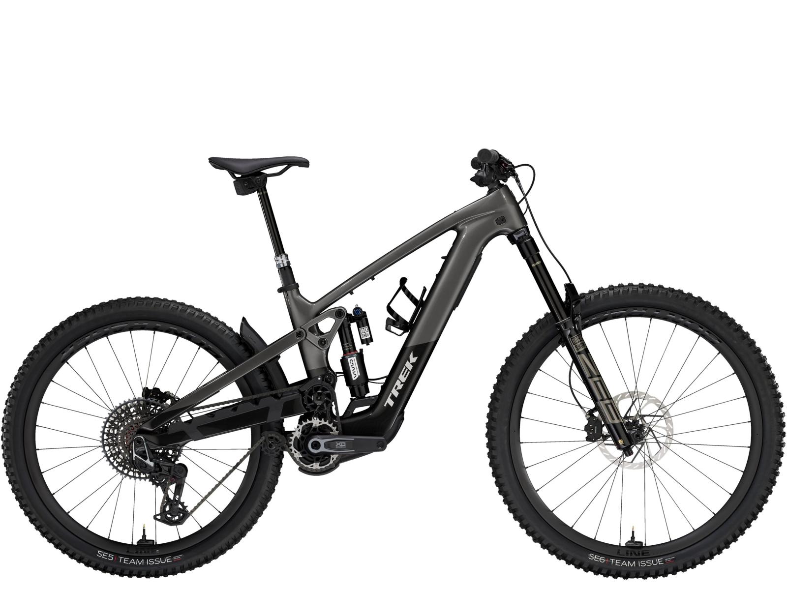 Einen Rahmen aus OCLV Mountain Carbon mit hohem Hinterbaudrehpunkt sowie einen leisen, aber mächtigen TQ HPR50 Motor mit 50 Nm Drehmoment und 250 W Leistung samt 580-Wh-Akku. Für die 170 mm vorderen und hinteren Federweg eine RockShox ZEB Ultimate Deluxe Gabel mit DebonAir Feder und Charger 3.1 Dämpfung und ein RockShox Vivid Ultimate Dämpfer. Robuste Bontrager Line Pro 30 Laufräder aus OCLV Mountain Carbon mit Mullet-Setup (29" vorn, 27,5" hinten), eine RockShox Reverb Variostütze, SRAM Maven Silver 4-Kolben-Scheibenbremsen und eine direkt montierte drahtlose, elektronische SRAM X0 AXS Transmission runden die Ausstattung ab.
