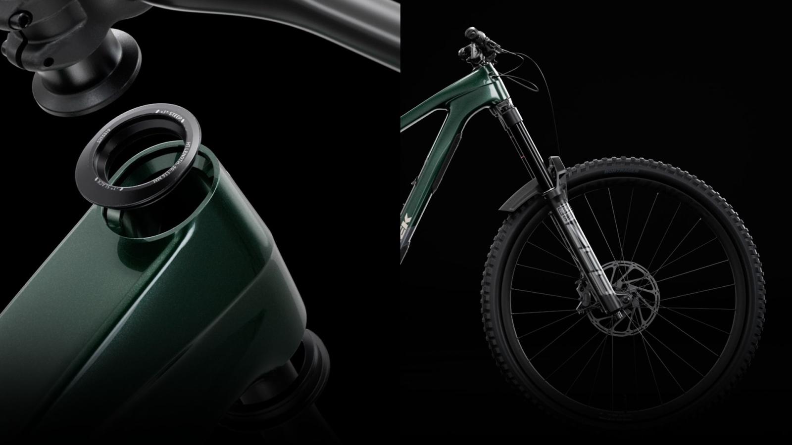 Rahmen: OCLV Mountain Carbon, herausnehmbarer Akku, hoher Hauptdrehpunkt, Umlenkrolle, Steuersatz mit verstellbarem Lenkwinkel, verstellbare Progression, integrierter Rahmenschutz, interne Zugführung, Alu-Umlenkhebel, Aufnahme für obere Kettenführung, 55 mm Kettenlinie, ABP, UDH, 148 x 12 mm Steckach